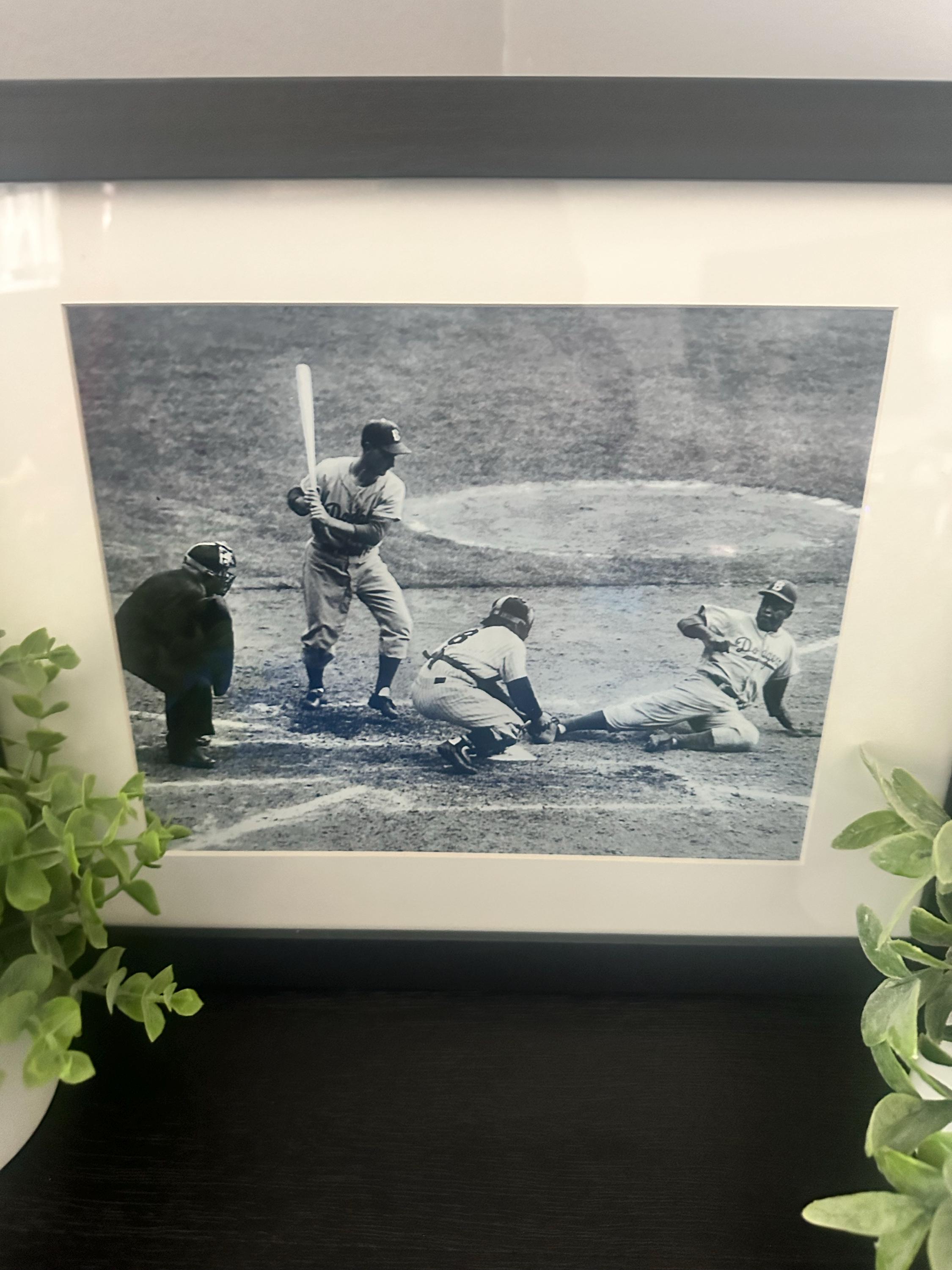 Amazing matted and framed image showing Jackie Robinson sliding in at the plate as he attempts to steal home in Game 1 of the 1955 World Series between the Brooklyn Dodgers and New York Yankees. Robinson was ruled safe. Catcher Yogi Berra strongly disagreed with the call and claiming over the years - "He Was Out!"