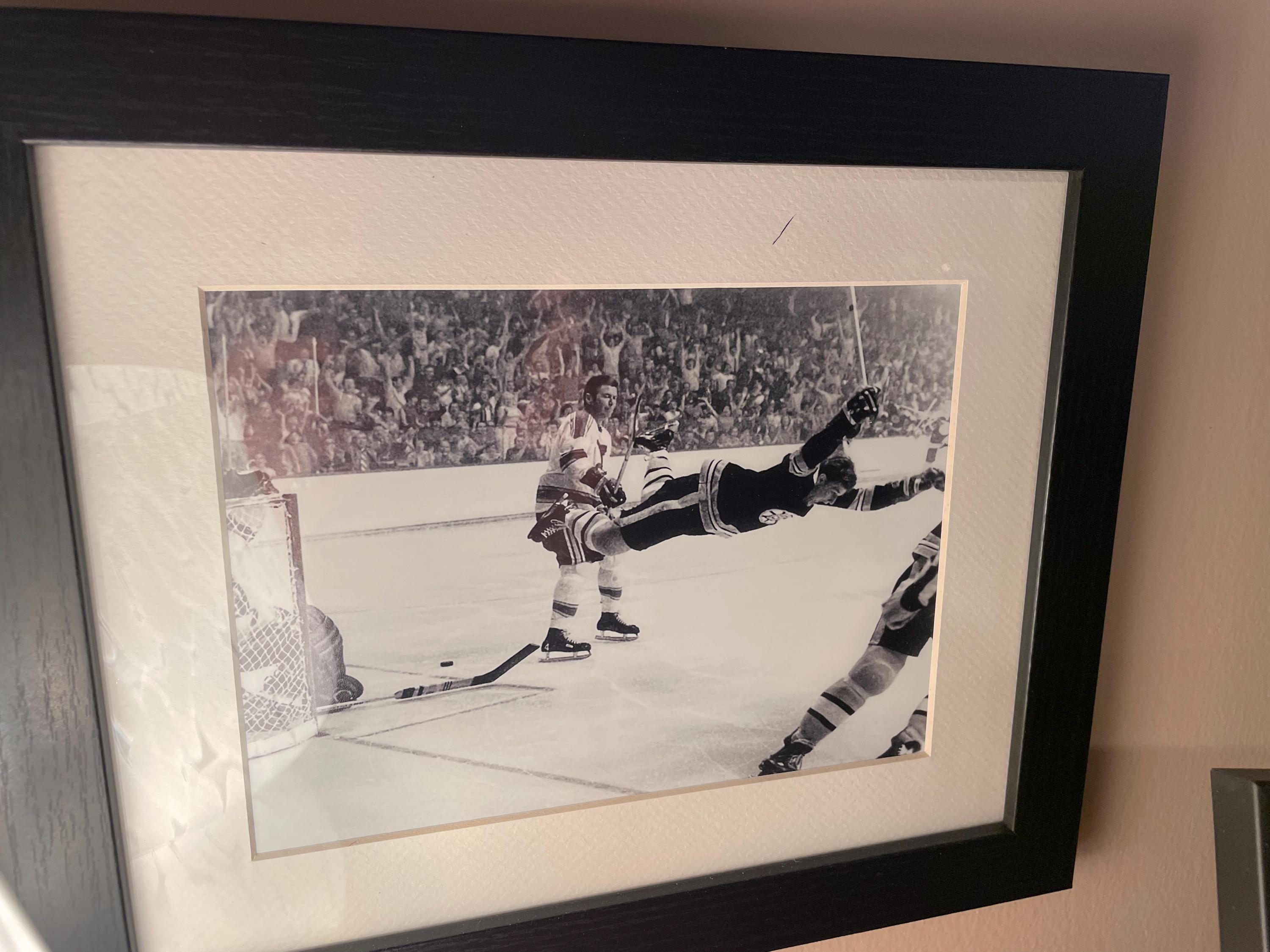 This matted and framed vintage sports wall hanging shows Bobby Orr scoring the winning "Flying Goal" in the 1970 Stanley Cup Finals against Glenn Hall of the St. Louis Blues.